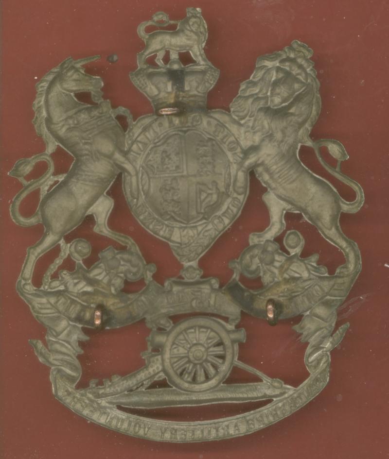 A fine scarce die-stamped white metal example worn circa 1878-1900. Royal Arms with scroll below inscribed '15th' over a gun resting on a scroll inscribed 'Lancashire Artillery Volunteers'. Three loops to reverse. VGC