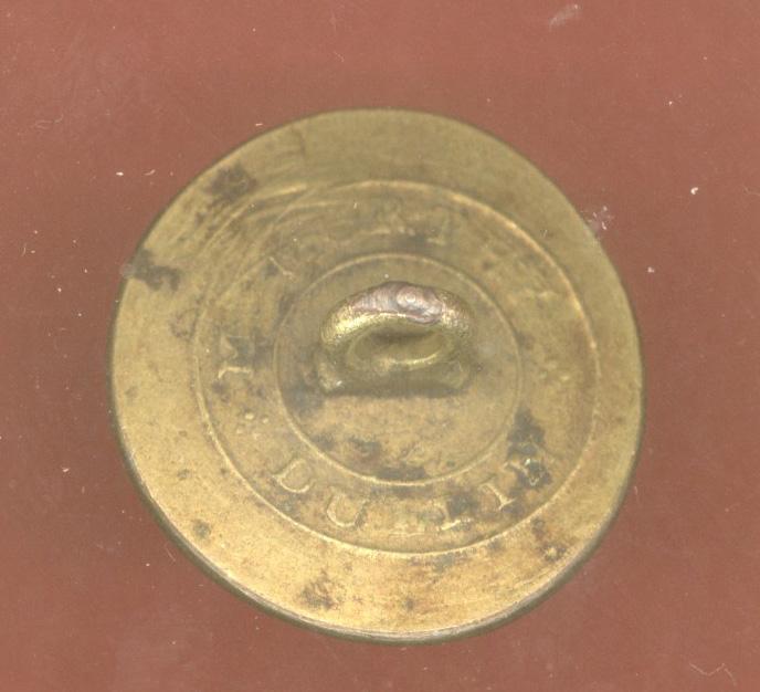 A super scarce flat 22mm diameter gilt button worn circa 1796-1801 . Circlet inscribed "PRO REGE ET PATRIA" & "1796" with "L C" to unvoided centre . Shank to the reverse. Makers stamp M. Murphy, Dublin. GC.