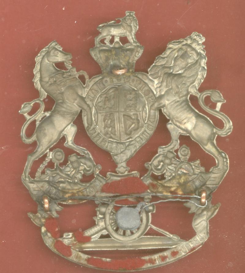 A fine scarce die-stamped white metal example worn circa 1878-1900. Royal Arms with scroll below inscribed 'laurels' over a gun resting on a scroll inscribed 'Aberdeenshire Artillery Volunteers'. Three loops to reverse. VGC