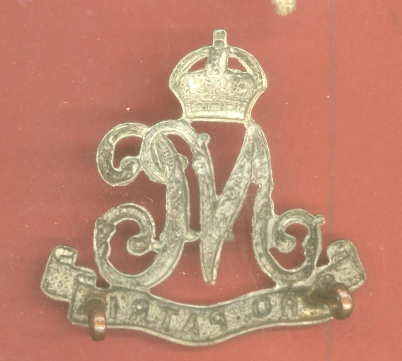 A fine scarce post 1902 large crown die-stamped white metal crowned floreated NC resting on PRO PATRIA scroll. Two loops to the reverse. VGC. Owen 363...