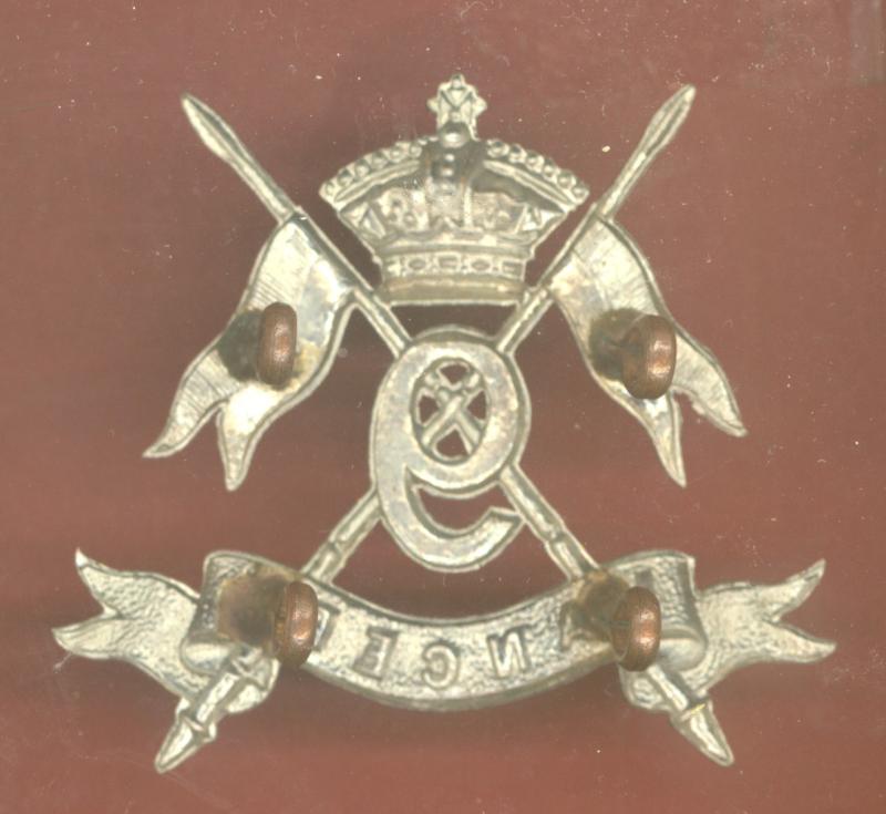 A fine and scarce die stamped white metal example. Crossed lance's surmounted by a Victorian crown, "9" to the centre of lance's. Below a scroll inscribed "Lancers". Four loops to the reverse. VGC.