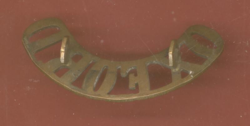 A good scarce brass shoulder title worn circa 1907-1908 by 1st battalion and 1907-1913 by 2nd battalion. Two hex type lugs to the reverse. VGC. Westlake 1176