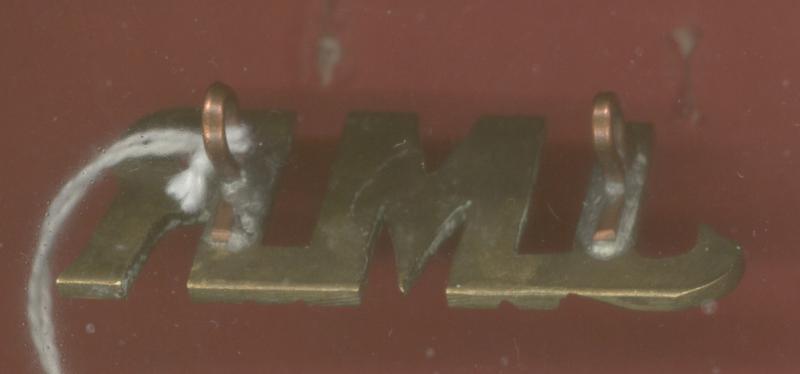 Good scarce J.M.R in block capitals hand cut from sheet brass. Replacement loops to the reverse. GC