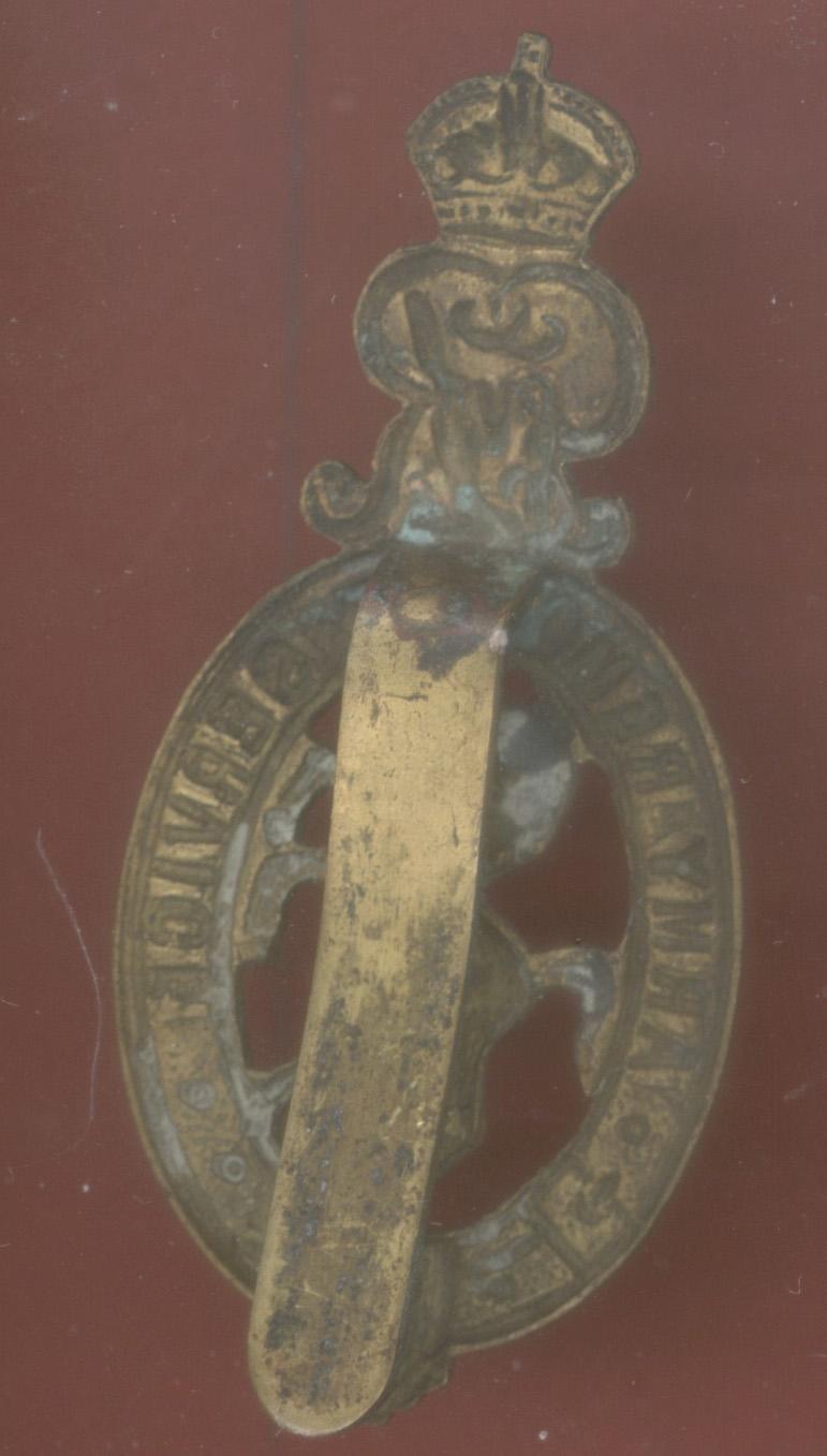 A good scarce die stamped brass metal ovalstrap "Army Remount Service" surmounted by crowned GvR cypher. Prancing horse to the centre. Slider to the reverse. VGC