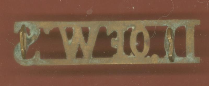 A good scarce brass shoulder title to the The Duke of Wellington's Regiment worn circa 1920-31 on No1 dress. Two loops to the reverse. VGC. Westlake 1069