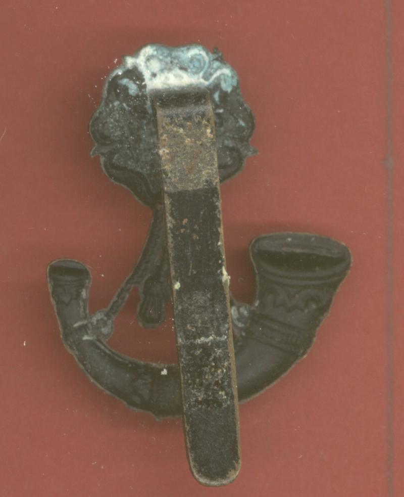 A good scarce die stamped blackened brass Rose above strung bugle example. Slider to the reverse. VGC.