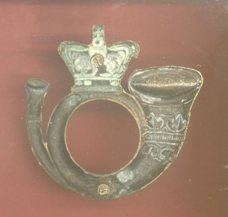 A fine pre 1901 general service die stamped brass metal example. Crowned french horn. Two screw posts to the reverse. VGC. 43.6mm x 43mm