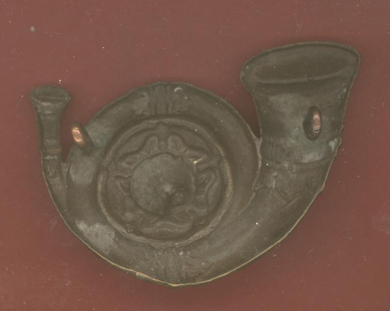 A scarce large die stamped brass French horn with white metal Yorkshire Rose to the centre. Two loops to the reverse. VGC. KK 669