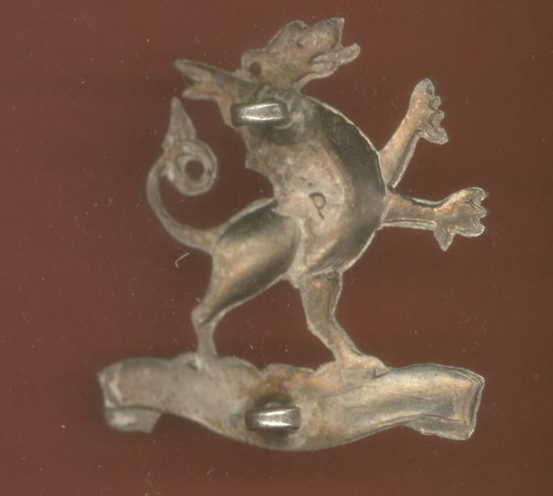 A fine scarce die-cast silver plated (stamped 'P') Dragon on ground over title scroll. Two long loops to the reverse. VGC.