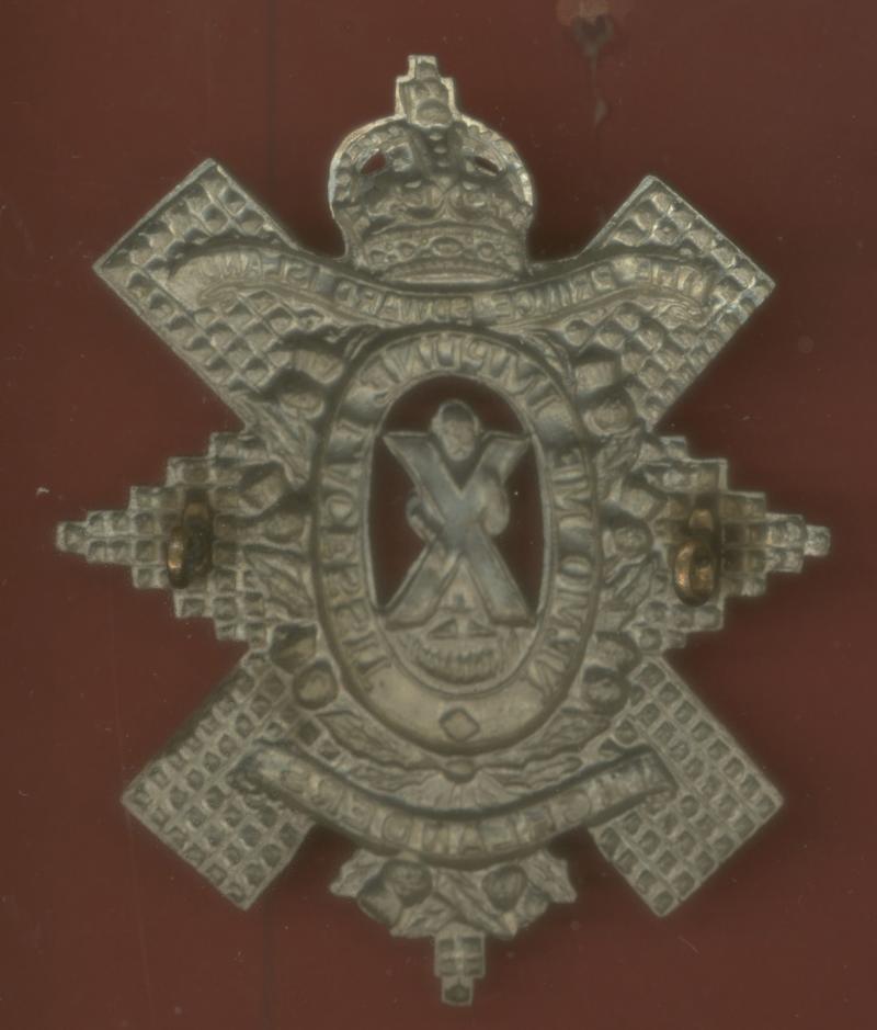 A good scarce post 1931 die stamped white metal Other Ranks glengarry badge of Black Watch design. 'HIGHLANDERS' in large letters. Two loops to the reverse . VGC Mazeas M.120