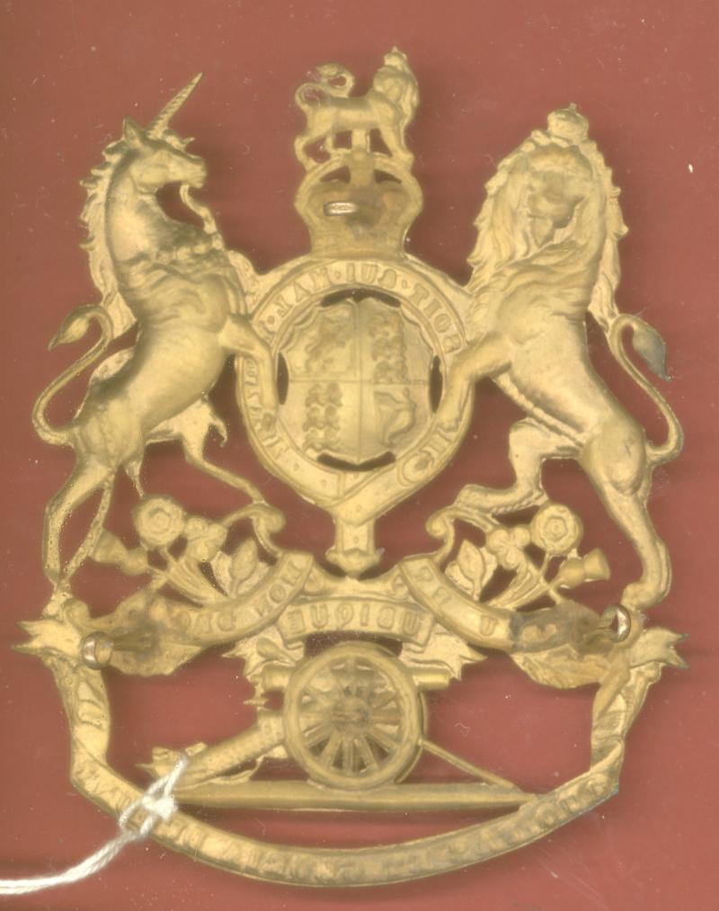 A fine die-stamped rich gilt example worn circa 1902-1914. Royal Arms, unvoided around the shield, with scroll beneath inscribed 'Ubique' over a gun, resting on a scroll inscribed 'Quo Fas Et Gloria Ducunt'. Three loops to reverse. Very Good condition.